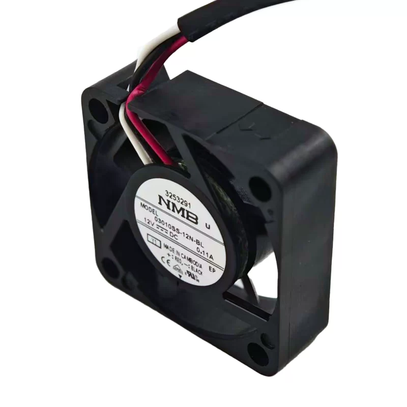 The NMB 03010SS-12N-BL-Y1 is a high-performance micro cooling fan with dimensions of 30 x 30 x 10 mm. Driven by a precision Brushless DC Motor, this ultra-compact axial fan operates on a nominal 24 VDC, making it an ideal choice for high-voltage industrial applications within a minimal footprint. With a rated current of 0.11 A and a power input of 2.64 W, it delivers a superior airflow of 4.24 CFM (7.2 m³/h) at a high speed of approximately 9500 RPM. Specifically engineered as a high-density micro cooling solution, it features a durable 5-blade plastic impeller and a specialized sleeve bearing system optimized for quiet, stable operation in extremely confined spaces. This three-wire model, weighing only 8.5 g, includes a tacho signal output for real-time monitoring, providing reliable thermal management for compact industrial controllers, medical sensors, and micro-electronic modules.