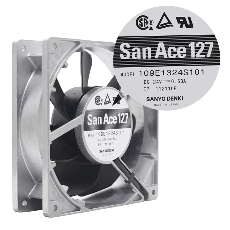 The Sanyo Denki 109E1324S101 is a high-performance 24VDC axial fan with dimensions of 127 x 127 x 38 mm, specifically engineered for reliable thermal management in industrial equipment and server enclosures. As part of the San Ace 127 series, this cooling solution features a robust aluminum frame and a specialized 7-blade high-efficiency impeller, optimized for superior aerodynamic throughput and long-term structural stability. It operates at a rated speed of 3,450 min⁻¹, delivering a maximum air flow of 154.0 CFM (261.6 m³/h) and a static pressure of 0.502 inH₂O (125.0 Pa). Equipped with a precision dual ball bearing system and an integrated speed sensor, the 109E1324S101 ensures a reliable service life of 60,000 hours at 60 °C. This model is characterized by its superior build quality and legacy of reliability, making it a critical component for power supplies, telecommunications racks, and medical diagnostic equipment.
