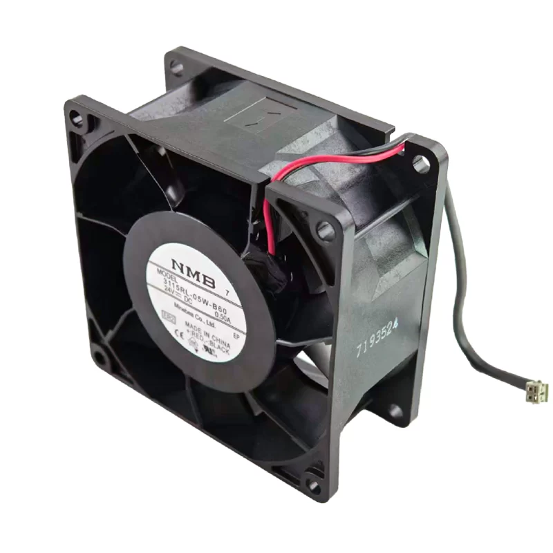 The NMB 3115RL-05W-B60-ER2 is an ultra-high-performance industrial DC Axial Fan with dimensions of 80 x 80 x 38 mm. Driven by a high-torque 4-pole Brushless DC Motor, this 3115RL series model is specifically engineered as a primary inverter cooling fan operating on a nominal 24 VDC. It delivers an intensified airflow performance driven by a rated current of 0.17 A and a power input of 12.0 W. This specialized version is fully IP68-rated, featuring a completely encapsulated motor and PCB to provide total protection against dust ingress and continuous immersion in water. With a specialized 9-blade aerodynamic design, it is optimized to generate extreme static pressure to overcome high-resistance airflow paths. Equipped with a premium dual-ball bearing system and a robust two-wire termination, the 3115RL-05W-B60-ER2 provides mission-critical thermal management and ultimate environmental durability for ruggedized frequency inverters and outdoor automation systems.