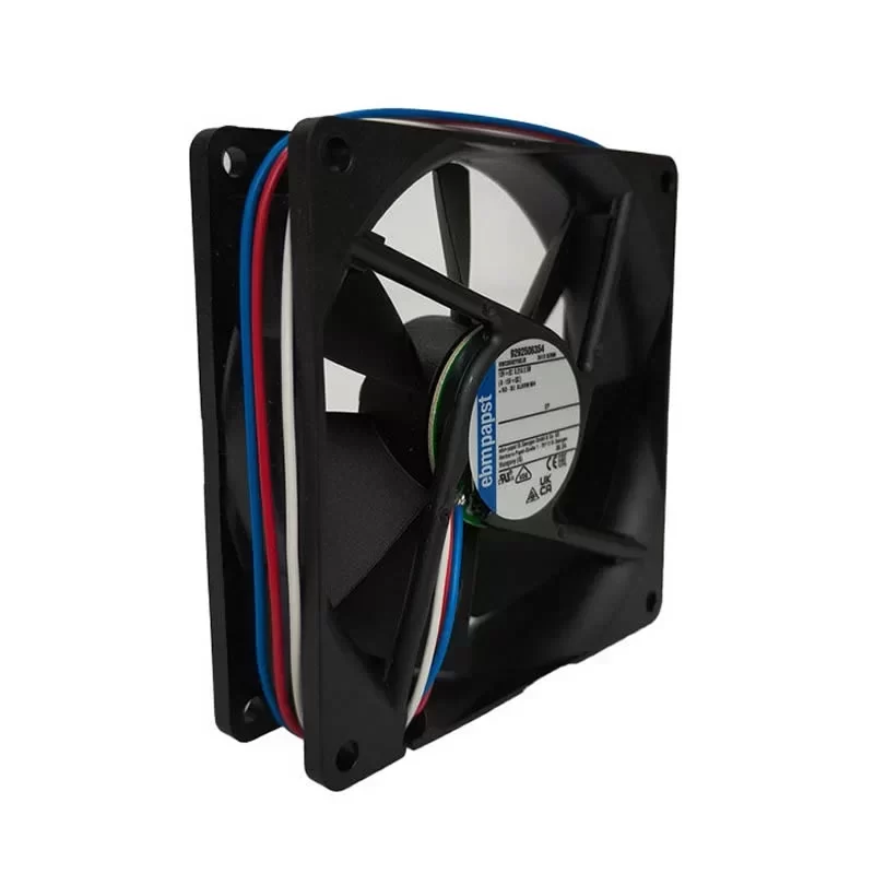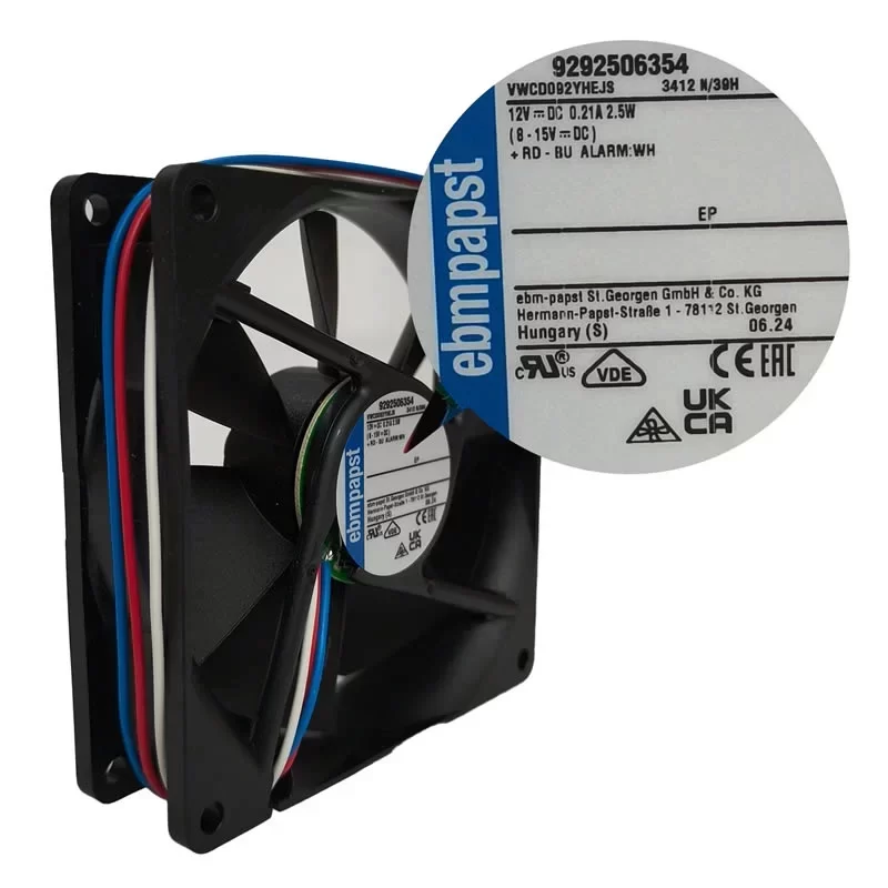 The ebmpapst 3412N/39H (VWCDO92YHEJS/9292506354) is a high-performance 12 V DC Axial Fan with dimensions of 92 x 92 x 25 mm, specifically engineered for critical thermal management in Siemens drive systems and compact industrial electronic cabinets. This unit features an integrated Speed Signal (Tachometer) output for real-time monitoring of fan performance. Driven by an electronically commutated external rotor motor with auto-restart locked-rotor and reverse polarity protection, it provides a precise Max. Power Consumption of 2.5 W and a Max. Current Draw of 0.21 A at 12 V DC. Operating at a optimized rated speed for efficient heat extraction, it delivers consistent airflow with high reliability. Constructed with a glass-fiber reinforced PBT plastic housing and a 3-blade impeller featuring precision ball bearings, this 100 g unit ensures maximum cooling density and long-term mechanical stability for integrated industrial switchgear systems at the end.