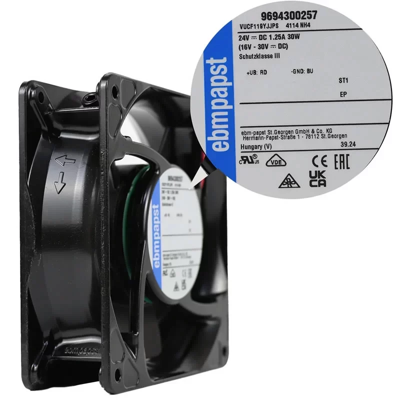 The ebmpapst 4114NH4 (VUCF119YJJPS/9694300257) is a high-performance 24 V DC Axial Fan with dimensions of 119 x 119 x 38 mm, specifically engineered for critical thermal management in Siemens Industrial Frequency Converters and high-power VFD cooling systems. Driven by an electronically commutated external rotor motor with integrated auto-restart locked-rotor protection and reverse polarity protection, this unit provides a substantial Max. Power Consumption of 30.0 W and a Max. Current Draw of 1.25 A at 24 V DC. Operating at an elevated rated speed of 6800 RPM, it delivers a powerful airflow of 350.0 m³/h (206.0 CFM) for efficient heat extraction in high-density electronic environments. Constructed with a heavy-duty die-cast aluminum metal housing and a 5-blade glass-fiber reinforced plastic impeller featuring precision dual ball bearings, this 390 g unit provides a dependable air-moving solution with a sound power level of 7.4 bel(A), ensuring maximum cooling performance and long-term mechanical stability for high-power inverters and integrated industrial switchgear systems at the end.