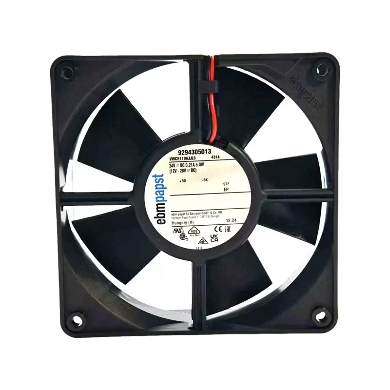 The ebmpapst 4314 (P/N 9294305013) is a high-performance 24VDC DC Axial Fan with dimensions of 119 x 119 x 32 mm, featuring a glass-fiber reinforced PBT housing and a 5-blade PA impeller, specifically engineered for mission-critical cooling in Industrial Frequency Converters. Driven by an electronically commutated external rotor motor with ball bearings, this 0.220 kg unit operates on a 12.0 – 28.0 VDC supply delivering a Max. Power Consumption of 5.0 W and a Max. Current Draw of 0.21 A at a rated speed of 2800 RPM. This High-performance unit achieves a Max. Air Flow of 100.06 CFM (170.0 m³/h / 2.83 m³/min) and a Max. Static Pressure of 8.16 mmH₂O (80.0 Pa / 0.32 inAq). Featuring integrated protection against reverse polarity and blocking alongside AWG 22 TR 64 leads, this unit is optimized for industrial VFD systems requiring efficient airflow and high operational reliability at the end.