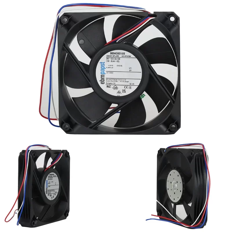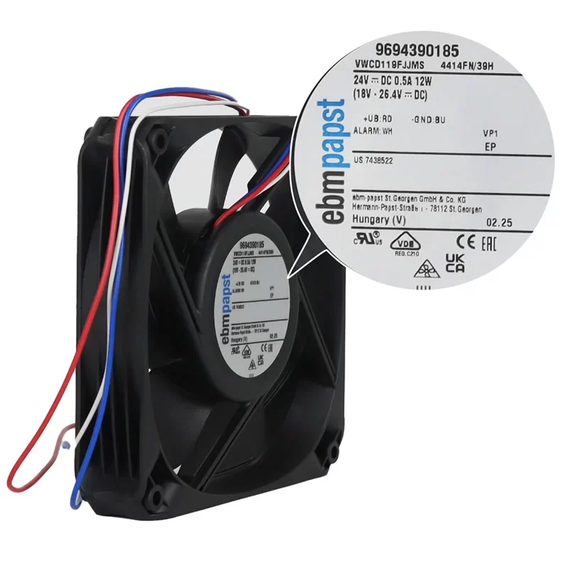 The ebmpapst 4414FN/39H is a high-performance DC Axial Fan from the 4400 Series, engineered for efficient heat dissipation in tight spaces. The fan’s precise measuring dimensions are 119 x 119 x 25.4 mm, and it has a mass of 0.245 kg. Operating at a nominal voltage of 24 VDC (with an operating range of 18 to 26.4 VDC), this model is built for continuous operation (S1). It achieves a high nominal speed of 5400 RPM, producing a maximum airflow of 225 m3/h while maintaining a noise level of 55 dB(A). Constructed with fiberglass-reinforced PBT plastic housing and PA plastic impeller, the fan utilizes durable Ball bearings and includes safety features such as reverse polarity and blocked rotor protection. Its 3-wire termination includes an Alarm signal for system monitoring, ensuring reliable thermal management in demanding electronic enclosures and network infrastructure.