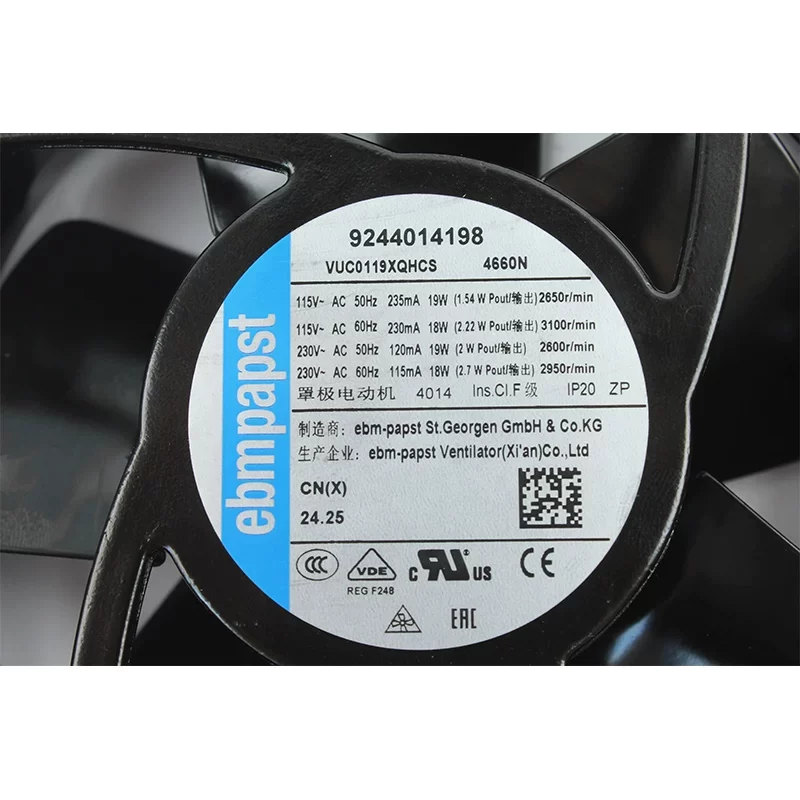 The ebmpapst 4660N is a high-performance DC Axial Fan with dimensions of 119 x 119 x 38 mm. This versatile AC axial fan features a dual-voltage, multi-frequency design capable of operating at both 115 VAC and 230 VAC (50/60 Hz) through flexible wiring configurations. Built with a heavy-duty die-cast aluminum housing and a sheet steel impeller, it delivers a maximum airflow of 100.0 CFM (170 m³/h) at 60 Hz. The fan utilizes a precision sleeve bearing system and an impedance-protected external rotor motor, ensuring reliable cooling in demanding industrial environments. It is an ideal thermal solution for control cabinets, power supplies, and high-density electronic racks that require a rugged, all-metal construction and adaptable electrical compatibility.