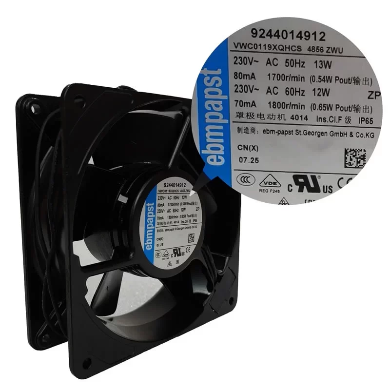 The ebmpapst 4856ZWU (Part No. 9244014912) is a specialized 230 V AC axial fan from the VWC0119XQHCS series, featuring a 119 mm all-metal construction for extreme durability. Driven by a precision-engineered shaded-pole motor, this unit is optimized for consistent air displacement with a low power output of 0.54-0.65 W while maintaining a steady 1700-1800 RPM. The “WU” designation and IP65 rating signify ultra-protection, utilizing an encapsulated motor design that ensures reliable performance in environments prone to dust and water jets. With a robust die-cast aluminum housing and sheet steel impeller, it provides excellent thermal dissipation and structural integrity. This industrial-grade cooling solution is specifically designed for long-life operation in outdoor cabinets, refrigeration units, and marine applications across a wide ambient temperature range from -40 °C to 75 °C.