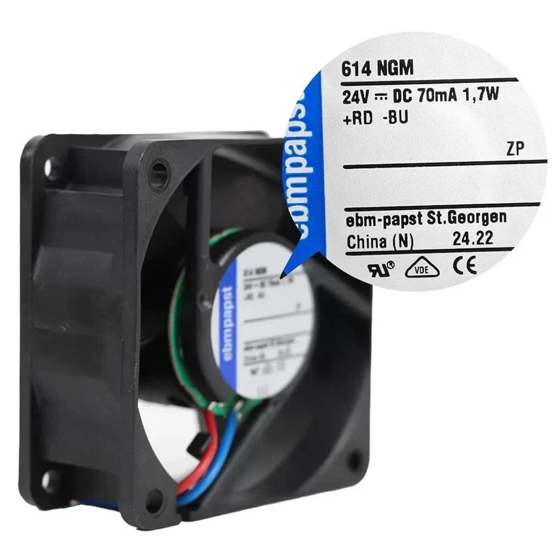 The ebmpapst 614NGM is a high-performance 24 VDC axial compact fan featuring a 60 mm aerodynamic impeller designed for efficient thermal management in space-constrained environments. Driven by a brushless DC motor with an external rotor, this unit is engineered for optimized air displacement, delivering a powerful airflow of 35 m³/h at a rated speed of 4100 RPM. The unit operates with a nominal current of 70 mA and a power consumption of 1.7 W, balancing high-velocity cooling with energy efficiency. The robust design features a glass-fiber reinforced PBT plastic housing and a glass-fiber reinforced PA plastic impeller, ensuring exceptional structural rigidity and low noise emissions. Equipped with a premium Sintec sleeve bearing system and comprehensive electronic protection against reverse polarity and locked-rotor conditions, the 614NGM provides a professional-grade cooling solution for industrial controllers and telecommunications modules across an ambient temperature range of -20 °C to 70 °C.