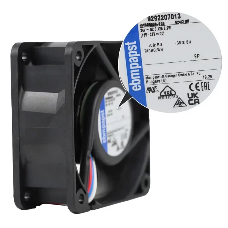 The ebmpapst 624/2HH is a high-performance 24V DC Axial Fan featuring a 5-blade plastic impeller and a robust Brushless DC Motor design. Operating within a voltage range of 18-28 VDC, this unit is optimized for energy efficiency, consuming 2.9 W with a nominal current of 0.12 A. It delivers a powerful airflow of 56 m³/h (33.0 CFM) and a static pressure of 145 Pa (0.58 inAq) at a rated speed of 8200 RPM. The fan is housed in a compact 60.0 x 60.0 x 25.0 mm plastic frame, weighing 0.070 kg, and is suitable for any mounting position. Engineered for long-term reliability, it offers a service life (L10) of 65,000 hours at 40 °C, and up to 110,000 hours according to IPC 9591 standards. With a 3-wire configuration including a speed signal and multiple international approvals (CE, EAC, UL, VDE, CSA), the 624/2HH is a premier thermal management solution for high-density electronic enclosures and industrial control systems.