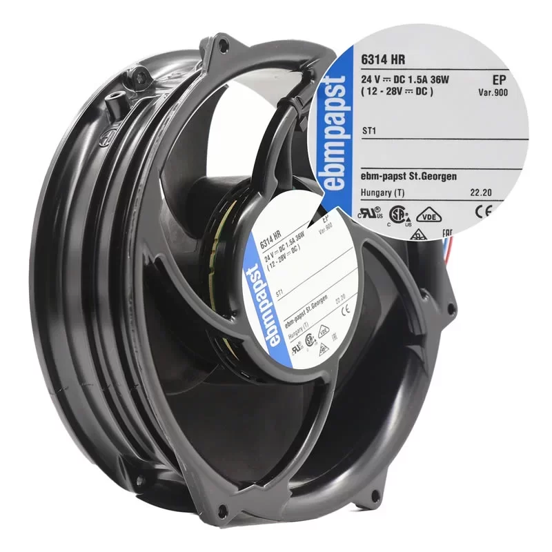The ebmpapst 6314HR-900 is a specialized 172mm brushless DC fan designed for high-performance cooling in 24V industrial environments. Its metal housing and high torque mounting capability (460 Ncm) make it suitable for heavy-duty applications such as large power supply units, frequency inverters, and industrial control cabinets. The 510 m³/h airflow and 380 Pa pressure rating allow it to efficiently dissipate heat in densely packed enclosures. With a wide operating voltage range and robust ball bearing construction, it is an ideal choice for 24/7 telecommunications base stations and mission-critical server infrastructure where reliability across varying temperatures is essential.