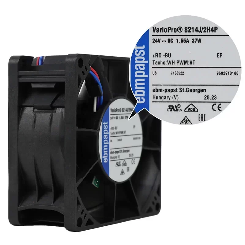 The ebmpapst 8214J/2H4P is a high-performance 24 VDC DC Axial Fan with dimensions of 80 x 80 x 38 mm, specifically engineered for demanding thermal management in industrial frequency converters and electrical control cabinets. Driven by a robust brushless DC motor with integrated electronic speed control, this unit provides a precise power consumption of 37 W and a nominal current of 1.55 A at 24 VDC. Operating at a peak speed of 14,000 RPM, it delivers a powerful airflow of 220.0 m³/h for efficient heat extraction. Constructed with a high-strength plastic housing and impeller featuring a precision ball bearing system, this 0.21 kg unit provides a dependable air-moving solution with a noise level of 71.0 dB(A) and IP20 protection, ensuring maximum cooling performance and long-term mechanical stability for high-power inverters, variable frequency drives (VFD), and integrated electrical switchgear systems at the end.