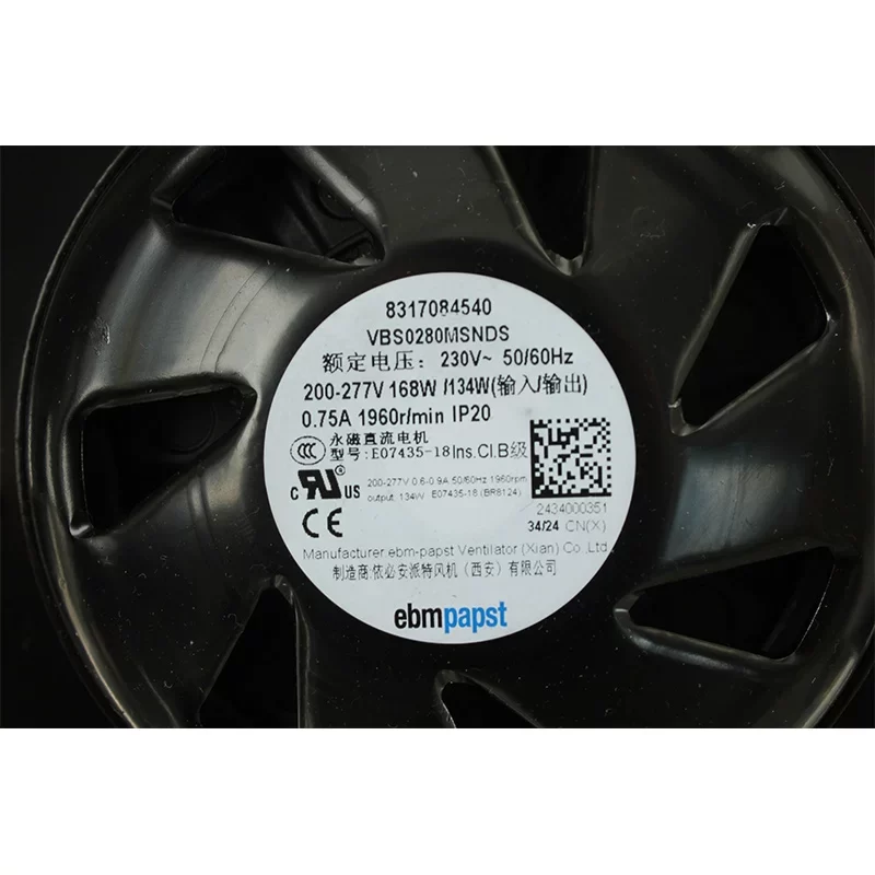 The ebmpapst VBS0280MSNDS (8317084540) is a high-performance single-phase EC Axial Fan with a 280 mm impeller, designed for precision thermal management in commercial and industrial cooling systems. Driven by GreenTech EC technology, this model operates on a versatile 200-277 VAC input, offering significant energy savings compared to traditional AC fans. It delivers a reliable maximum airflow of 1385 m³/h (815 CFM) at a rated speed of 1960 RPM. With a 168 W power input and a high-efficiency 134 W output, the VBS0280MSNDS provides the stable static pressure necessary for consistent air circulation in HVAC units and specialized refrigeration equipment. This 2.93 kg compact air mover features an IP20-rated design and integrated intelligent electronics, supporting 0-10V or PWM speed modulation for optimized energy management in 230V single-phase industrial environments.