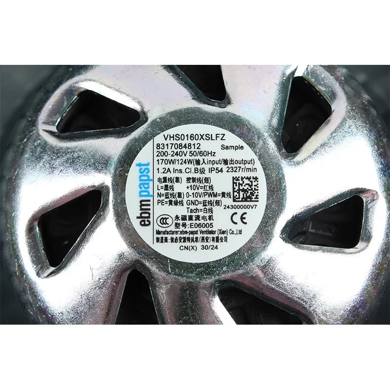 The ebmpapst 8317084812 VHS0160XSLFZ is a heavy-duty 230 VAC EC Centrifugal Fan with a 160 mm RadiCal impeller, engineered for high-performance condensing technology and industrial air filtration. Driven by a high-torque E06005 permanent magnet DC motor with integrated EC electronics, this unit operates within a 200 – 240 VAC range, delivering a Max. Power Consumption (Input) of 170 W with an output of 124 W at a rated speed of 2327 RPM. Featuring a precision-balanced 2.8 kg assembly and a high-strength impeller, it achieves a Max. Air Flow of 526.0 m³/h (309.6 CFM) and a Max. Static Pressure of 61.18 mmH₂O (600.0 Pa / 2.41 inAq). Constructed with a heavy-duty motor housing, this German-engineered unit provides IP54 protection and supports stepless speed control for mission-critical HVAC and heating systems requiring maximum structural integrity and energy efficiency at the end.