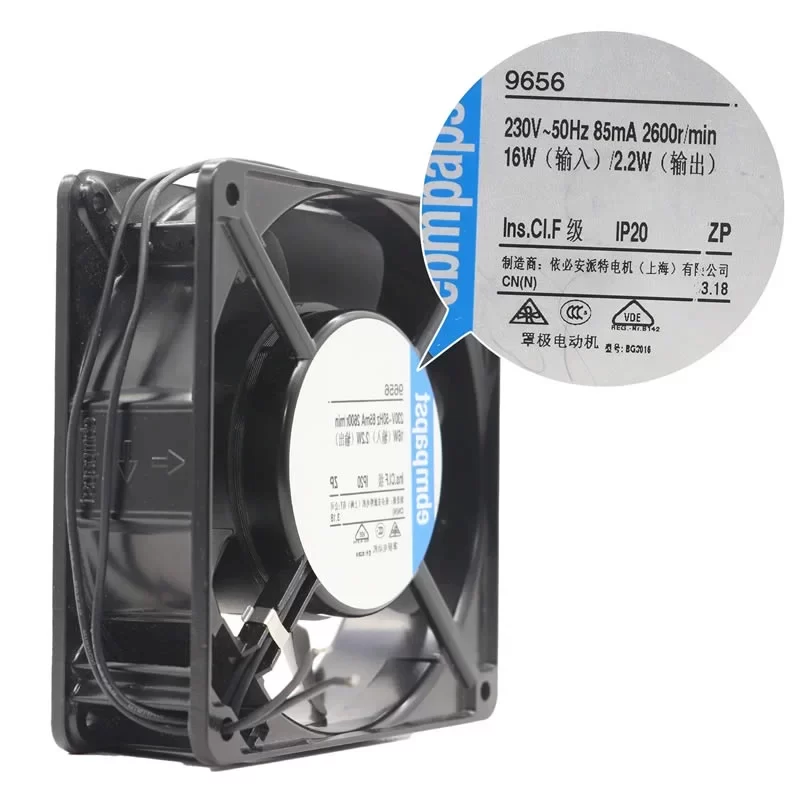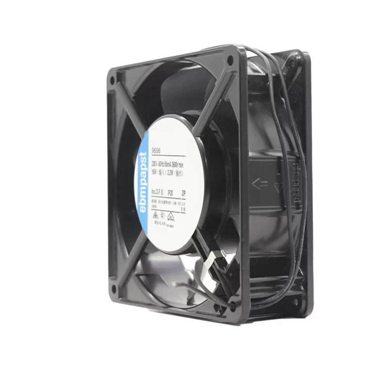 The ebmpapst 9656 is a high-reliability AC Axial Fan with dimensions of 119 x 119 x 38.7 mm, featuring a robust metal housing and plastic impeller. Operating at a nominal 230V (50Hz), this unit is powered by an efficient AC drive that draws 85 mA and delivers an input power of 16W, resulting in an output of 2.2W. It achieves a nominal speed of 2600 RPM ±10%, providing a free air flow of 146 m³/h against a static pressure of 58 Pa. Designed for extreme versatility, it supports any mounting position and operates within a wide temperature range from -40°C to 75°C. With an IP20 protection rating and a maintenance-free ball bearing system, the 9656 offers a service life of 37,500 hours at 40°C, making it a dependable thermal management solution for industrial cabinets and electronic enclosures.