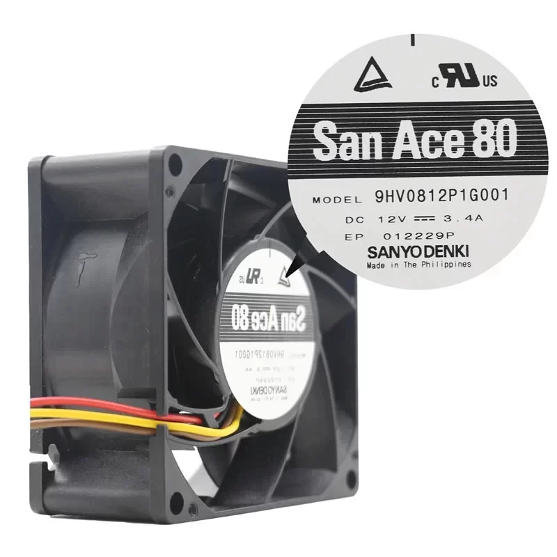 The Sanyo Denki 9HV0812P1G001 is a high-performance 12VDC axial fan with dimensions of 80 x 80 x 38 mm. This industrial-grade cooling solution is engineered for ultra-high static pressure and extreme speed operation, ensuring optimal thermal management in high-impedance electronic environments. It features a robust dual ball bearing system, a 5-blade high-efficiency impeller, and PWM speed control for precise airflow regulation and an extended service life. The unit is specifically designed for high-density servers, networking equipment, and industrial power supplies where space is limited but heat dissipation requirements are extreme.