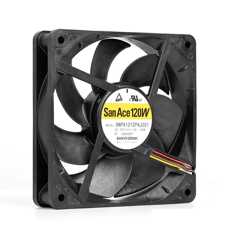 The Sanyo Denki 9WPA1212P4J001 is a high-performance DC Axial Fan with dimensions of 120 x 120 x 25 mm. Operating on 12 V DC, this San Ace 120W series fan is specifically engineered for long-term reliability in harsh environments, featuring a certified IP68 rating for complete protection against dust and water immersion. With a high airflow of 252 m³/h and a high static pressure of 210 Pa at 5400 RPM, it is an ideal thermal solution for outdoor EV chargers, PV inverters, and telecommunications equipment requiring precise PWM speed control.