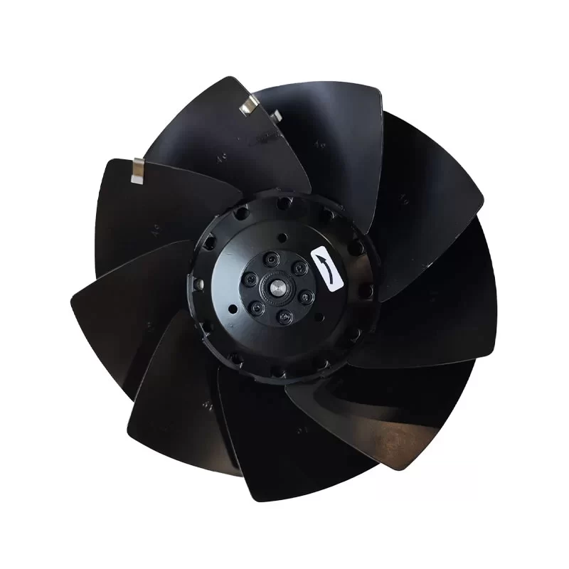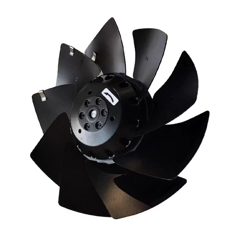 The ebmpapst A2D200-AI18-01 is a professional 400 V three-phase AC axial fan featuring a 200 mm nine-blade impeller constructed from robust black-coated sheet steel. Driven by the M2D068-BC external rotor motor, this unit is optimized for Star (Y) connection, delivering a powerful airflow at speeds up to 2900 RPM. The aerodynamic design is specifically engineered for “A” direction airflow (intake over struts), providing efficient cooling with a power input of 68-70 W. Built for S1 continuous duty, it features premium ball bearings, IP44 protection, and Class B insulation with an F1-2 humidity class rating. This compact and durable axial fan is an ideal solution for heat exchangers and industrial ventilation systems, operating reliably across an ambient temperature range up to 70 °C (at 60Hz).