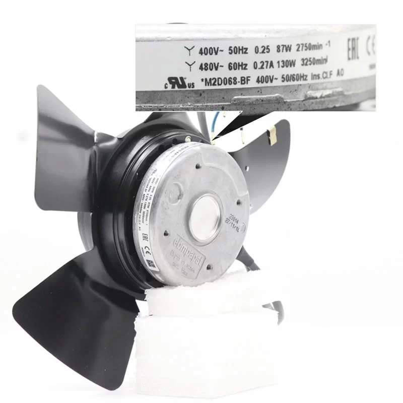 The ebmpapst A2D210-AA10-17 is a high-performance 400VAC three-phase AC Axial Fan featuring 5 sickle-shaped blades with a robust Impeller Size of 210 mm. Specifically engineered for mission-critical cooling of Siemens servo spindle motors and industrial heat exchangers, this unit is driven by the M2D068-CF external rotor motor with maintenance-free ball bearings. Operating on a 400 VAC / 480 VAC supply, it delivers a Power Consumption of 87 W / 105 W / 130 W and a Current Draw of 0.25 A / 0.20 A / 0.27 A at rated speeds of 2750 / 3150 / 3250 RPM. Featuring a rugged sheet steel construction with a black-painted finish, it ensures superior aerodynamic efficiency, low noise emissions, and an extended service life in continuous S1 environments at the end.