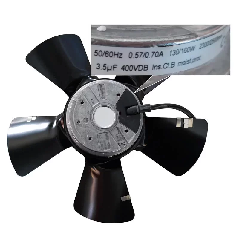 The ebmpapst A2E250-AE65-02 is a high-performance 230VAC single-phase AC Axial Fan featuring 5 straight blades with a robust Impeller Size of 250 mm. Driven by the M2E068-DF external rotor motor with maintenance-free ball bearings and a 4 µF / 400 VDB capacitor, this unit is specifically engineered for mission-critical heat exchangers, air conditioning units, and industrial cooling applications. Operating on a 230 VAC supply, it delivers a Power Input of 115 W / 165 W and a Current Draw of 0.51 A / 0.74 A at rated speeds of 2550 / 2750 RPM. Featuring a rugged sheet steel construction with a black-coated finish, it ensures superior aerodynamic efficiency, high static pressure capability (150 Pa), and reliable continuous S1 operation at the end.