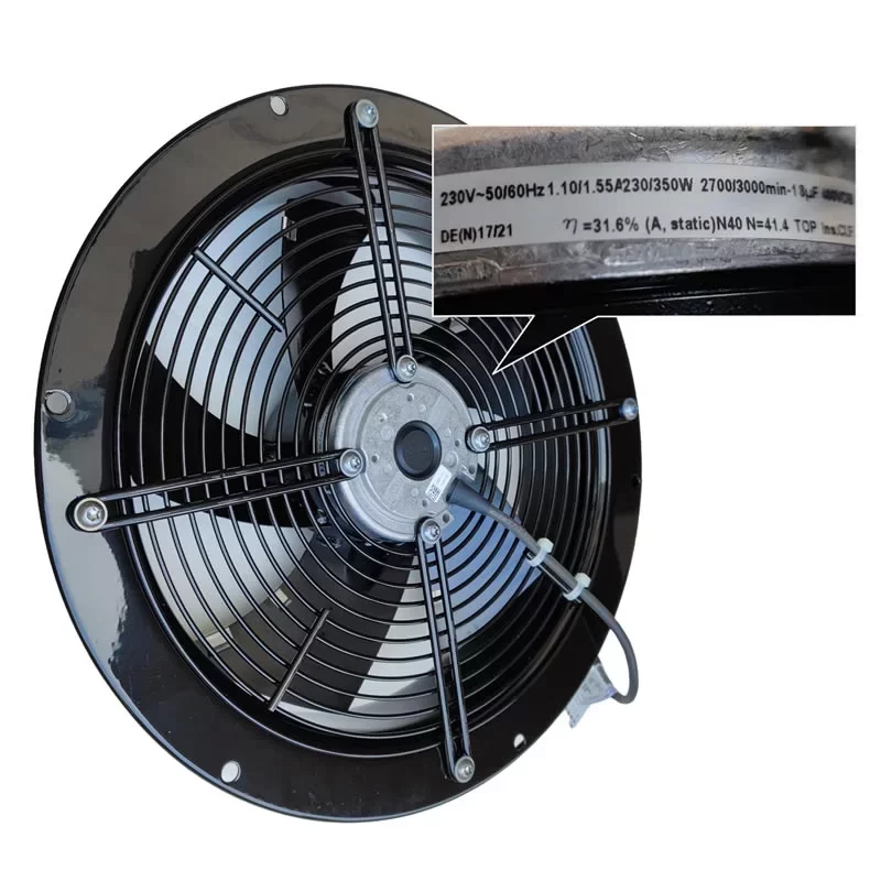 The ebmpapst A2E300-AP02-01 is a high-performance 230VAC AC Axial Fan featuring a 300 mm specialized aerodynamic sickle-shaped sheet steel impeller, specifically engineered for mission-critical cooling in Industrial Frequency Converters and specialized ventilation systems. Driven by an M2E074-DF external rotor motor with maintenance-free ball bearings and moisture protection (H1), this 3.13 kg unit operates at 230 VAC / 50/60 Hz delivering a Max. Power Consumption of 230.0 / 350.0 W and a Max. Current Draw of 1.10 / 1.55 A at a rated speed of 2700 / 3000 RPM. This High-performance unit achieves a Max. Air Flow of 2245.0 m³/h at optimum efficiency, with a Max. Static Pressure of 16.32 / 5.10 mmH₂O (160.0 / 50.0 Pa / 0.64 / 0.20 inAq). Featuring a robust construction with an integrated thermal overload protector (TOP) and black painted motor surface, this IP44-rated unit meets ErP 2015 efficiency standards (N=41.4) and is optimized for environments requiring high reliability and industrial-grade airflow in VFD systems at the end.