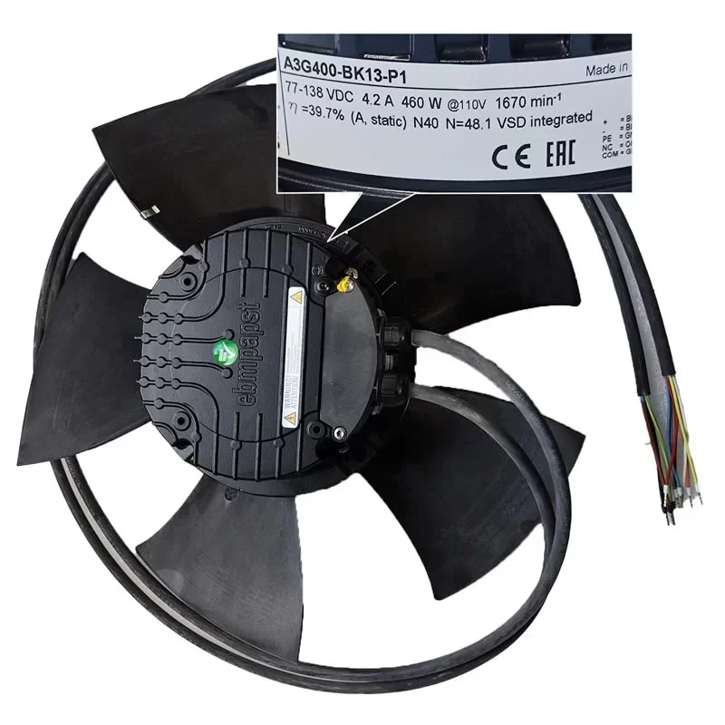 The ebmpapst A3G400-BK13-P1 is a high-performance 110V DC EC Axial Fan featuring a 400 mm impeller diameter and powered by the advanced M3G084-DF motor. This unit is specifically engineered for demanding environments, operating on a nominal 110 VDC with a wide range of 77-138 VDC. It delivers a rated speed of 1670 RPM at maximum load, consuming 460 W with a current draw of 4.2 A. The fan features 5 blades made of PA plastic (UL94 V0) and a black-painted die-cast aluminum electronics housing. With an IP55 protection rating, H3 environmental protection class, and Class F insulation, the A3G400-BK13-P1 is optimized for S1 continuous duty in railway and heavy-duty industrial applications. It is fully equipped with modern control features including RS-485 MODBUS-RTU, 0-10V/PWM speed control, and comprehensive thermal and electrical protections.
