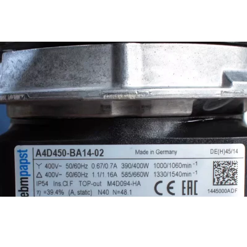 The ebmpapst A4D450-BA14-02 is a high-performance 400 VAC AC Axial Fan with an impeller size of 450 mm, specifically engineered for demanding thermal management in industrial frequency converters and electrical control cabinets. Driven by a robust three-phase M4D094-HA external rotor motor with a maximum power input of 660.0 W at 400 VAC/60 Hz (Delta connection), this precision unit operates at a maximum speed of 1540 RPM, delivering a powerful airflow for efficient heat extraction. Constructed with a 5-blade sheet steel impeller system coated in black featuring high-precision ball bearings and an ABS plastic terminal box, this 7.9 kg unit provides a dependable and energy-efficient air-moving solution with a static efficiency of 39.4% and IP54 protection, ensuring maximum cooling performance and long-term mechanical stability with a maximum safe operating speed of 1800 RPM for high-power inverters, variable frequency drives (VFD), and integrated electrical switchgear systems at the end.