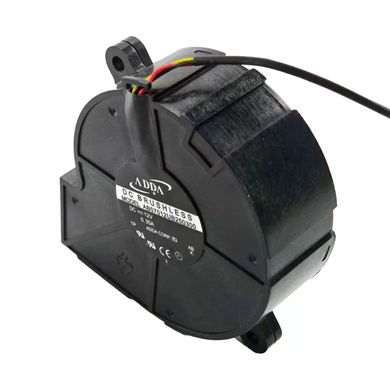 The ADDA AB07012UB250300 is a compact DC centrifugal blower, measuring 70 x 70 x 25 mm, engineered for thermal solutions that require high static pressure. Operating on a 12 V DC supply, this high-performance model draws 0.35 A of current and consumes 4.2 W of power. The blower utilizes a reliable Double Ball Bearing system to ensure long life, typically rated for 70000 Hours. It is constructed with a durable Plastic (PBT) frame and impeller, and features a 3-Wire termination for connection.