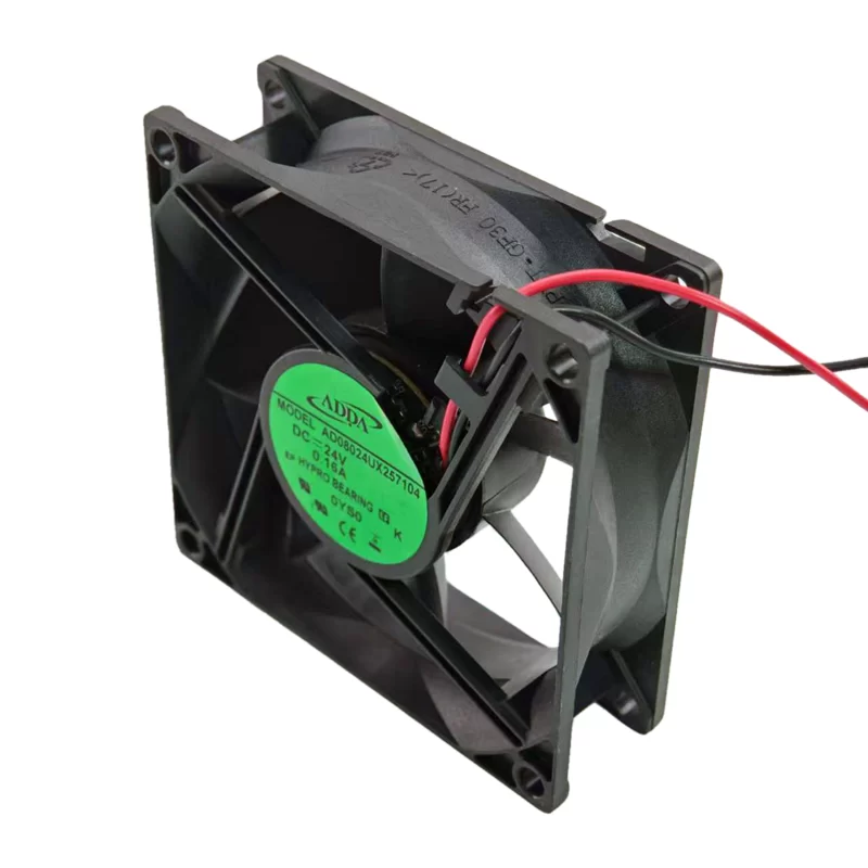 The ADDA AD08024UX257104 is a high-performance DC Axial Fan with dimensions of 80 x 80 x 25 mm. It operates on a nominal voltage of 24 V DC, consuming 2.4 W at a current rating of 0.1 A. Featuring a reliable HYPRO Bearing system, the fan delivers an airflow of 76.76 m3/h and a static pressure of 53.80 Pa at a speed of 3600 RPM, with a low noise level of 42 dBA. The lightweight 72 g unit is constructed entirely of Plastic for both the frame and impeller. This fan is engineered for standard-to-high cooling performance in server cabinets, power supplies, and telecommunication racks where efficiency and noise reduction are important.