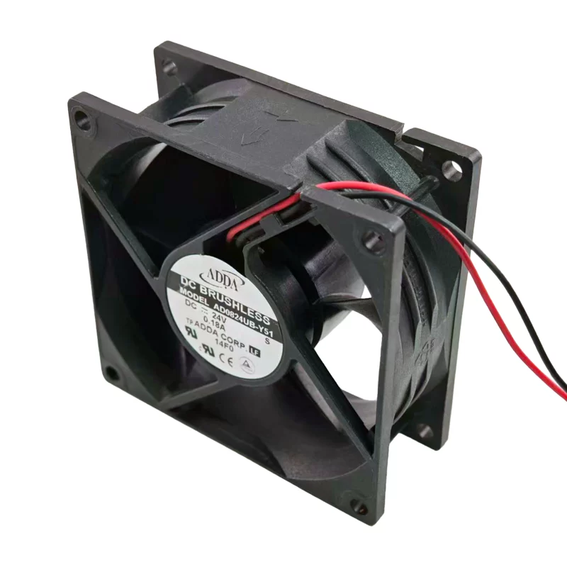 The ADDA AD0824UB-Y51 is a high-performance DC Axial Fan with dimensions of 80×80×32 mm. This Ultra High speed fan operates on a nominal 24 VDC voltage with 4.32 W of power consumption. It delivers a strong airflow of 94.8 m3/h (55.3 CFM) at a speed of 4200 RPM, generating a static pressure of 72.5 Pa (0.291 inH2O). The unit features a durable Ball Bearing system and holds multiple safety certifications including UL/CUL/TUV/CE.