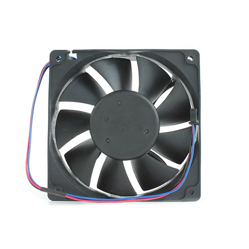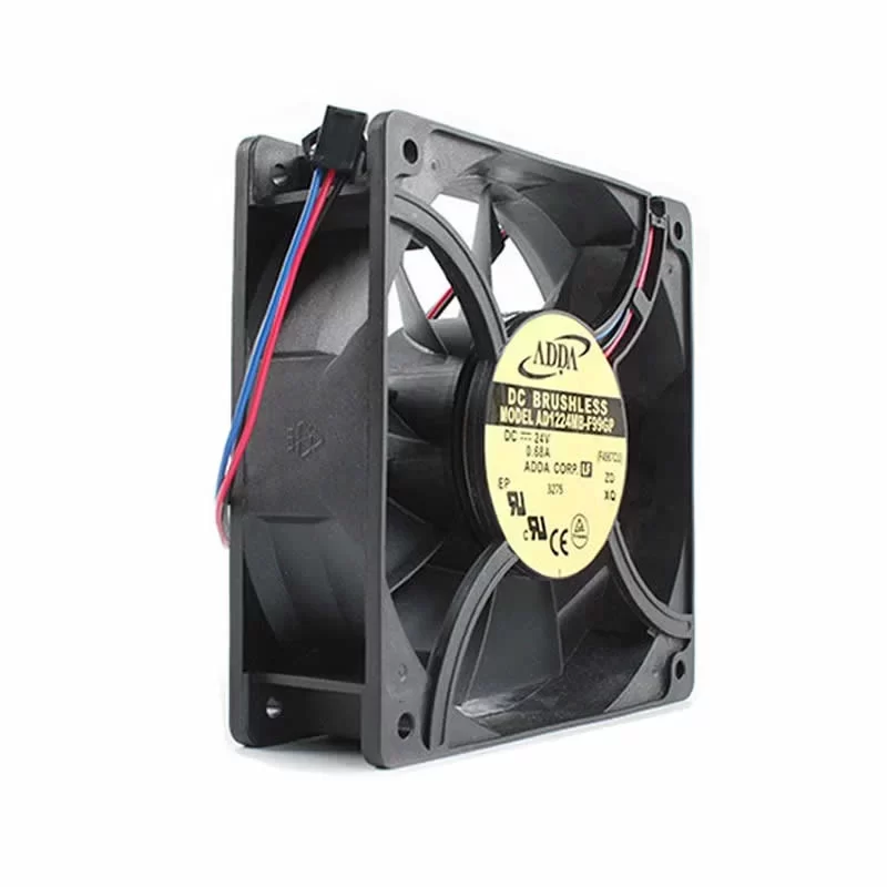 The ADDA AD1224MB-F99GP is an ultra-high-performance industrial DC Axial Fan with dimensions of 120 x 120 x 38 mm. Driven by a high-torque Brushless DC Motor, this 1224 series model is specifically engineered for heavy-duty thermal management, operating on a nominal 24 VDC. It delivers a powerful maximum airflow of 162 CFM (275.2 m³/h) at a high rated speed of 3800 RPM. With a rated current of 0.68 A and a power input of 16.32 W, it is designed to provide the intense static pressure (0.57 inAq) required to push air through high-resistance industrial systems. This model features a premium dual-ball bearing system and a specialized 9-blade aerodynamic impeller for maximum air displacement and stability. Equipped with a three-wire termination, the AD1224MB-F99GP includes an integrated tacho signal output for real-time speed monitoring, providing essential cooling for high-capacity industrial inverters, large server enclosures, and high-density power electronics.