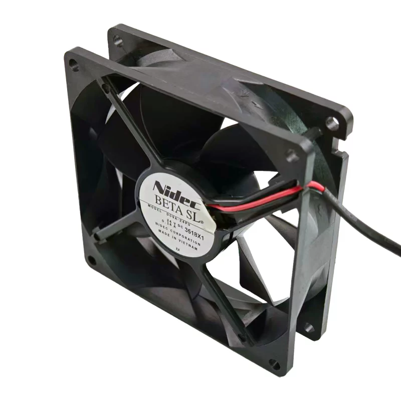 The Nidec D09A-24PU is a DC Axial Fan measuring 92×92×25 mm. Operating on 24 VDC, this fan has a rated current of 0.14 A and a power consumption of 3.36 W. The frame and impeller are constructed from Plastic (UL94V-0), and the fan features a Ball Bearing system for durability. This model is designed for reliable thermal management in compact electronic systems and industrial applications.
