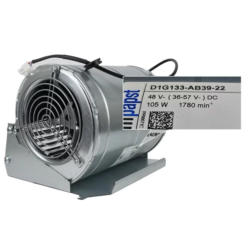 The ebmpapst D1G133-AB39-22 is a high-performance 48 VDC EC Centrifugal Fan with an impeller size of 133 mm, specifically engineered for demanding thermal management in industrial frequency converters and electrical control cabinets. Driven by a robust brushless EC external rotor motor with an integrated electronic control unit and a high power consumption of 105.0 W and a nominal current of 2.8 A, this precision unit operates at a rated speed of 1780 RPM, delivering a powerful single-intake airflow for efficient heat extraction. Constructed with a ruggedized die-cast aluminum housing and a galvanized sheet steel forward-curved impeller system featuring high-precision ball bearings and a 4-wire electrical interface supporting PWM speed control and tachometer feedback, this 3.2 kg unit provides a dependable and energy-efficient air-moving solution with IP42 protection and Class B insulation, ensuring maximum cooling performance and long-term mechanical stability for high-power inverters, variable frequency drives (VFD), and integrated electrical switchgear systems at the end.