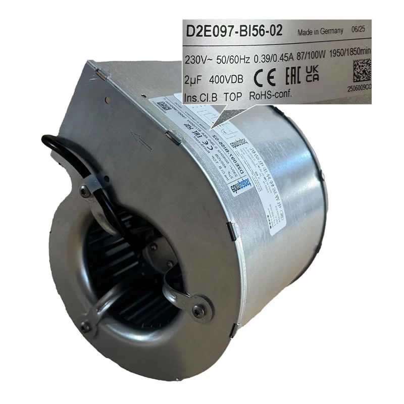 The ebmpapst D2E097-BI56-02 dual-inlet blower is specifically engineered for high-static pressure environments such as air conditioning fan coils, industrial air curtains, and localized cooling for large power electronics. Its dual-inlet configuration allows for higher airflow volumes within a compact footprint compared to single-inlet models. The galvanized steel construction ensures long-term resistance to environmental stress, while the M2E052-CA motor provides the reliability needed for 24/7 continuous operation. With its 230V AC input and integrated thermal burnout protection, this blower is a trusted component in medical ventilation systems, laboratory exhaust hoods, and modern building climate control infrastructures.
