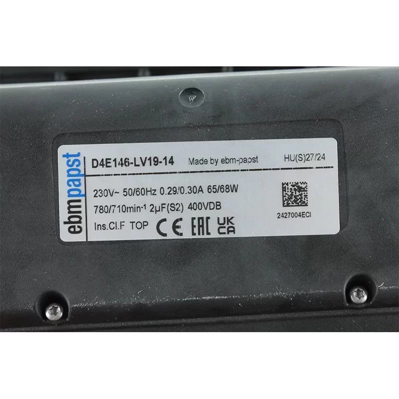 The ebmpapst D4E146-LV19-14 is a highly efficient 1-phase AC Dual Inlet Centrifugal Fan featuring a 146 mm PA plastic impeller and a robust PP plastic housing. Driven by the M4E068-CF external rotor motor with anti-vibration mounting on both sides, this unit is designed for versatile air displacement with 5 integrated speed steps. Operating at a nominal voltage of 230 VAC, it delivers a rated speed of 780 RPM (50 Hz) with a power input of 65 W, ensuring whisper-quiet and stable performance. This 2.5 kg module features an integrated terminal box with a pre-connected 2 µF capacitor and a convenient plug system for electrical connection. With IP44 protection, Insulation Class F, and an internal thermal overload protector, the D4E146-LV19-14 provides a reliable, vibration-damped cooling solution for residential ventilation, air purifiers, and light industrial HVAC systems.