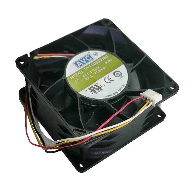 The AVC DYTB08038B8U-P086 is specifically engineered for high-density cooling in mission-critical 48V environments where extreme static pressure is required to overcome high system impedance in 2U server chassis, telecommunications rectifiers, and high-capacity industrial power converters, utilizing its 9000 RPM rotational speed and PWM control capability to allow for precise thermal regulation and massive heat extraction in tightly packed electronic enclosures, ensuring that even under peak loads, critical components stay within safe operating temperatures while the dual ball bearing system provides the 24/7 reliability needed for enterprise-grade hardware and infrastructure.