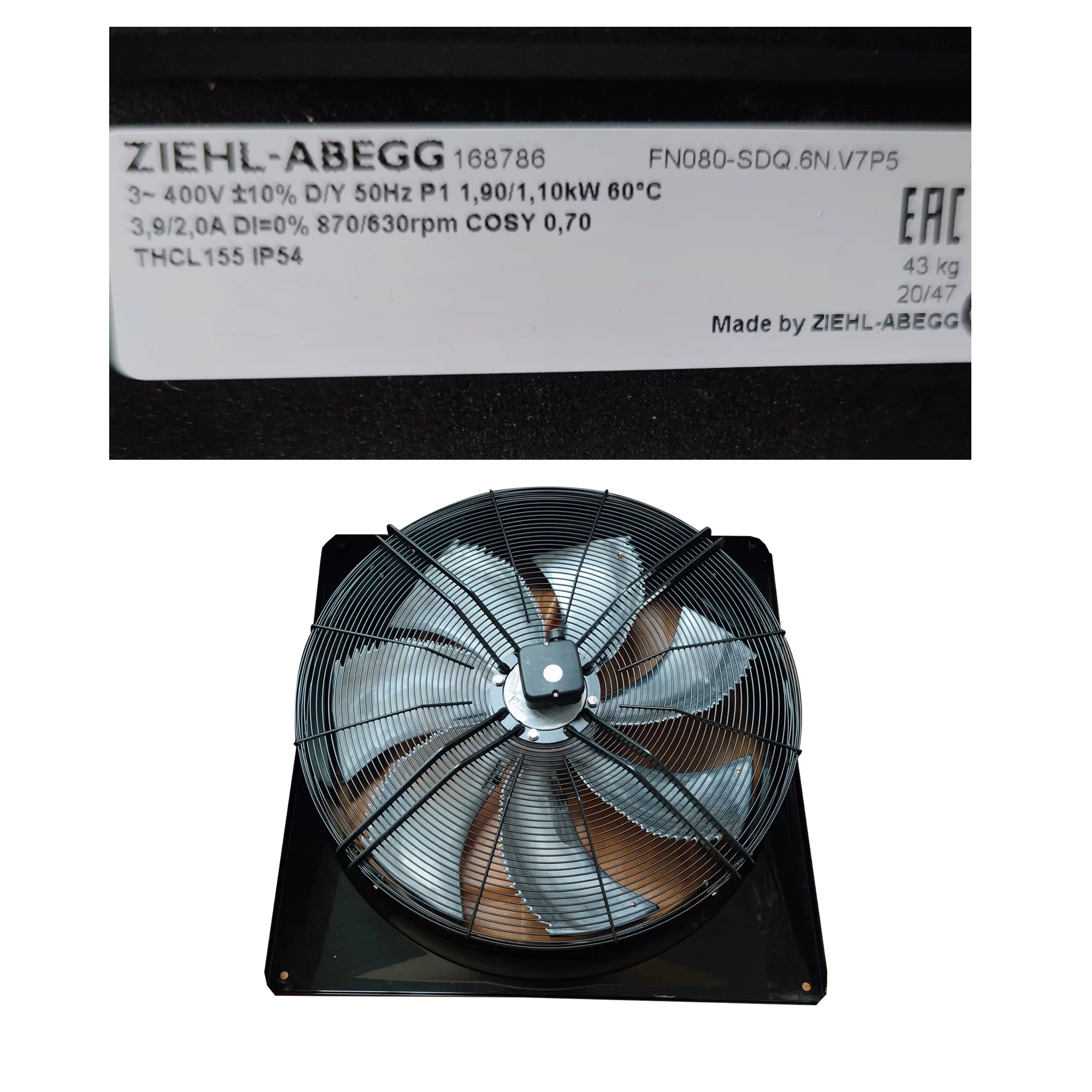 The ZIEHL-ABEGG FN080-SDQ.6N.V7P5 is a high-performance 400VAC three-phase AC Axial Fan featuring 800 mm specialized aerodynamic sickle-shaped aluminum blades and a high-torque 6-pole external rotor motor, specifically engineered for mission-critical cooling in Industrial Frequency Converters and specialized AHU systems. Driven by a precision-balanced motor with maintenance-free ball bearings, this 43.00 kg unit operates at 400 VAC / 50 Hz using a Delta/Star (D/Y) connection to provide dual-speed flexibility, delivering a Max. Power Consumption of 1.90 / 1.10 kW and a Max. Current Draw of 3.90 / 2.00 A at a rated speed of 870 / 630 RPM. This High-performance unit features a specialized aerodynamic 7-blade aluminum impeller achieving a Max. Air Flow of 16500.0 / 12000.0 m³/h (9711.2 / 7062.6 CFM / 275.00 / 200.00 m³/min) and a Max. Static Pressure of 15.30 / 8.16 mmH₂O (150.0 / 80.0 Pa / 0.60 / 0.32 inAq). Featuring a “Made in Germany” robust construction with integrated thermal contacts (TB) for motor protection, this IP54-rated fan is optimized for environments requiring high pressure stability and extreme reliability in industrial VFD systems at the end.
