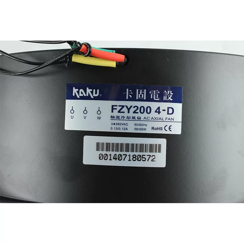 The KAKU FZY2004-D axial fan is used in electric welding machines, industrial refrigeration units, ultrasonic cleaning equipment, power distribution cabinets, and factory automation cooling systems.