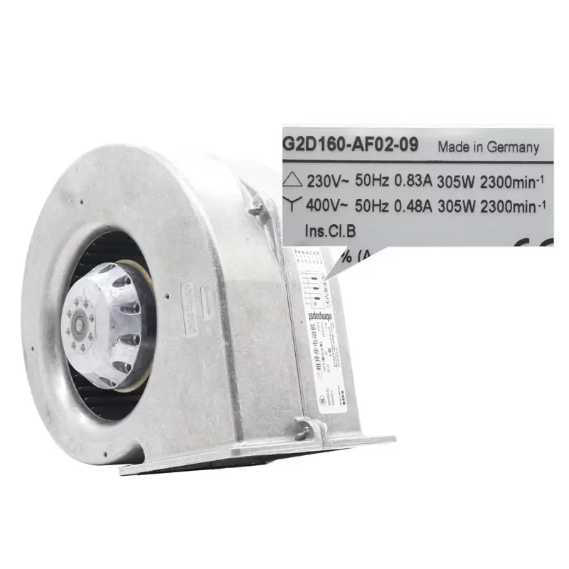 The ebmpapst G2D160-AF02-09 is a high-performance 230/400 VAC AC Centrifugal Fan with an impeller size of 160 mm, specifically engineered for demanding thermal management in industrial frequency converters and electrical control cabinets. Driven by a robust three-phase M2D068-EC external rotor motor with a power consumption of 305.0 W and a nominal current of 0.48 A at 400 VAC (Star connection), this precision unit operates at a rated speed of 2300 RPM, delivering a powerful single-intake airflow for efficient heat extraction. Constructed with a ruggedized die-cast aluminum housing with integrated flange and a galvanized sheet steel forward-curved impeller system featuring high-precision ball bearings and a die-cast aluminum terminal box, this 4.3 kg unit provides a dependable and energy-efficient air-moving solution with a static efficiency of 32.2% and IP44 protection, ensuring maximum cooling performance and long-term mechanical stability for high-power inverters, variable frequency drives (VFD), and integrated electrical switchgear systems at the end.