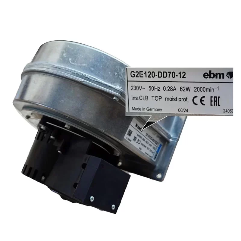 The ebmpapst G2E120-DD70-12 is a professional-grade 1~ AC single-inlet centrifugal fan powered by the M2E052-CA motor. Operating at a nominal 230 VAC (50 Hz), this unit is designed for high-static pressure applications with dimensions of 178 x 184 x 156.5 mm. It features a forward-curved multi-vane impeller made of galvanized sheet steel, housed within a robust die-cast aluminum scroll housing. At 50 Hz, it achieves a rated speed of 2000 RPM with a power consumption of 62 W and a low current draw of 0.28 A. The motor is mounted on a specialized support plate for one-sided vibration damping, ensuring quiet and stable operation. Rated with Class B insulation and H0+ environmental protection, the G2E120-DD70-12 utilizes a 2 µF capacitor and includes an internally connected thermal overload protector for mission-critical reliability in S1 continuous duty cycles.