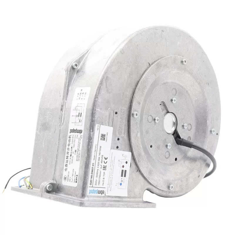 The ebmpapst G2E146-DW07-01 is a high-performance 230VAC single-phase AC Centrifugal Blower, featuring forward-curved impellers within a robust flanged housing. Made in Germany and driven by a specialized AC motor with integrated thermal overload protection (TOP), this 146 mm impeller size blower is specifically engineered for medical equipment, laboratory ventilation, and industrial cooling applications. Operating on a 230 VAC supply, it delivers a Power Consumption of 140 W / 155 W and a Current Draw of 0.62 A / 0.68 A at rated speeds of 1550 / 1750 RPM. Featuring a galvanized sheet steel impeller and a high-quality 3.0 µF / 450 VDB capacitor system, it ensures stable air delivery, low acoustic noise, and reliable continuous S1 operation in demanding environments at the end.