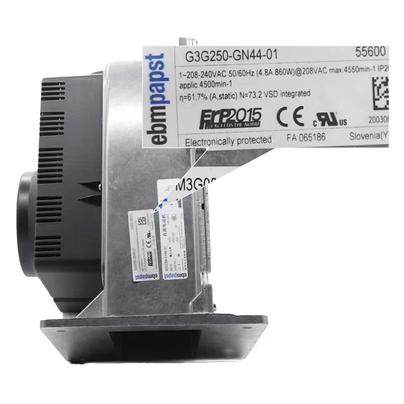 The ebmpapst G3G250-GN44-01 is a high-performance 230VAC single-phase EC Centrifugal Gas Blower, featuring backward-curved aluminium impellers within a heavy-duty flanged die-cast aluminium housing. Driven by the M3G084-FA GreenTech EC motor with integrated electronics and active PFC, this 250 mm impeller size blower is specifically engineered for gas-condensing heating systems and high-efficiency industrial combustion processes. Operating on a nominal voltage range of 208 to 240 VAC, it delivers a Power Input of 860 W and a Current Draw of 4.8 A at a rated speed of 4500 RPM. Featuring a black-coated rotor, a flame-retardant Polyflam protective cover, and a 0-10 VDC / PWM control interface, it ensures high-pressure air delivery, advanced thermal motor protection, and reliable continuous S1 operation in demanding heating environments at the end.