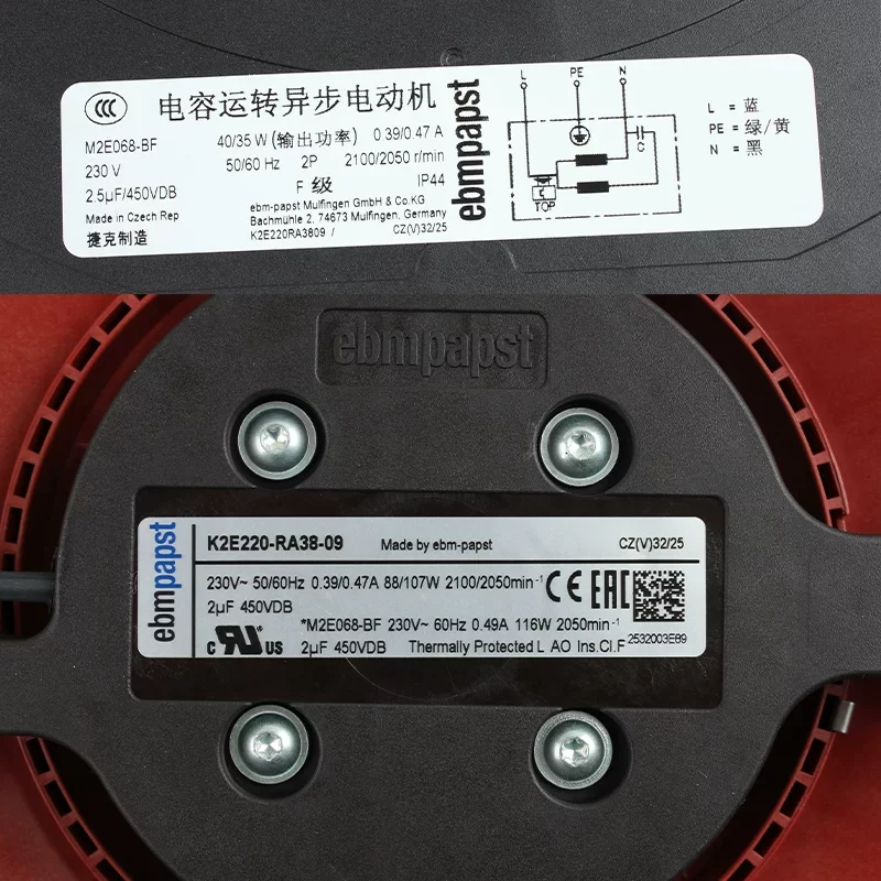 The ebmpapst K2E220-RA38-09 is a high-performance AC Centrifugal Fan with an impeller size of 220 mm and dimensions of 220 x 71 mm. This backward-curved centrifugal fan operates on a nominal 230 VAC (50/60 Hz) and belongs to the aerodynamically optimized RadiCal series. It features a high-tech composite material impeller (PA66, glass-fiber reinforced) designed for maximum efficiency and minimized noise turbulence. Delivering a maximum airflow of approximately 506.2 CFM (860 m³/h), it is powered by an asynchronous external rotor motor with an output power of up to 40 W. This model is engineered for high-pressure environments such as ventilation systems, precision air conditioning, and cleanroom modules, offering robust IP44 protection and a maintenance-free ball bearing system for long-term reliability in demanding industrial applications.