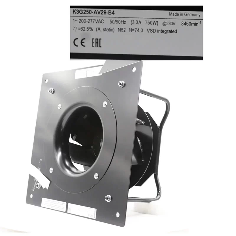 The ebmpapst K3G250-AV29-B4 is a high-performance 230VAC single-phase EC Centrifugal Fan from the RadiPac series, featuring backward-curved impellers with a support bracket. Driven by the M3G084-FA (Size 84) GreenTech EC motor with integrated control electronics and active PFC, this 250 mm impeller size module is specifically engineered for mission-critical HVAC systems, data center cooling, and industrial ventilation. Operating on a wide nominal voltage range of 200 to 277 VAC, it delivers a Power Consumption of 750 W and a Current Draw of 3.3 A at a rated speed of 3450 RPM. Featuring a sheet aluminum impeller, a die-cast aluminum electronics housing, and integrated RS-485 MODBUS-RTU communication, it ensures an impressive overall efficiency of 62.5% and reliable continuous S1 operation in demanding environments at the end.