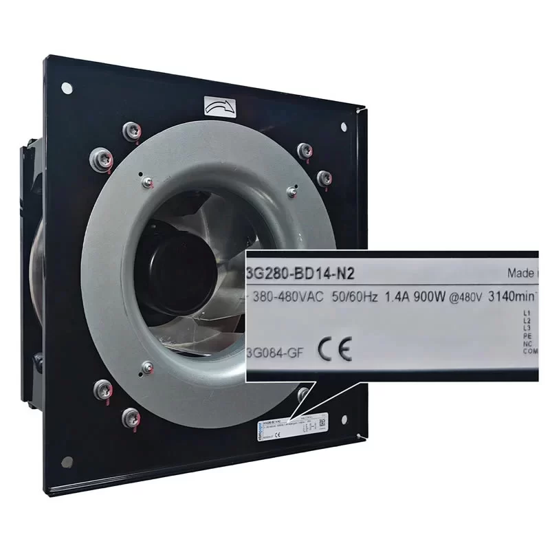 The ebmpapst K3G280-BD14-N2 is a specialized 380-480 V three-phase GreenTech EC centrifugal fan module from the RadiPac series, engineered to meet rigorous railway and industrial standards. Featuring a 280 mm backward-curved aluminum impeller within a robust cubic support structure, it is powered by the M3G084-GF motor, delivering 900 W of performance at speeds up to 3140 RPM. This module is uniquely certified to EN 45545-2 (HL3) for fire protection and EN 50155 for electronic equipment used on rolling stock, making it an ideal thermal management solution for railway technology and heavy-duty industrial AHU systems. Equipped with an RS-485 Modbus RTU interface, integrated PID controller, and emergency operation mode, it ensures maximum safety and reliability across an extreme ambient temperature range of -40 °C to 60 °C.