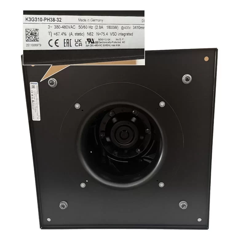 The ebmpapst K3G310-PH38-32 is an industrial-grade, three-phase RadiCal EC centrifugal motorized impeller designed for high-capacity air management in mission-critical HVAC and industrial cooling systems. Operating on a 380 – 480 VAC three-phase supply at 50/60 Hz, this unit features a high-performance integrated EC motor that delivers an input power of 1800 W at a nominal speed of 3410 RPM. The 310 mm backward-curved impeller, crafted from glass-fiber reinforced PA6 plastic, is optimized for peak aerodynamic efficiency and low noise emissions. Equipped with advanced electronics supporting RS485 MODBUS RTU and 0-10 VDC control, the K3G310-PH38-32 provides an IP54-rated, high-pressure thermal solution for demanding environments ranging from -25 °C to 60 °C.