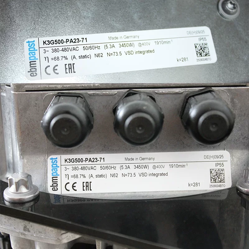 The ebmpapst K3G500-PA23-71 is a heavy-duty, high-performance 3-phase EC Centrifugal Fan module featuring a 500 mm backward-curved aluminum impeller. Driven by the M3G150-FF (Size 150) GreenTech EC motor, this 38.7 kg unit is a central component for high-capacity air handling units (AHU) and large-scale industrial ventilation. Operating on a 380-480 VAC supply, it delivers exceptional performance with a power consumption of 3450 W at a rated speed of 1910 RPM. This RadiPac unit is built for maximum durability, utilizing sheet aluminum for the 7-blade impeller, galvanized sheet steel for the support plate and inlet nozzle, and a die-cast aluminum electronics housing supported by black-painted steel brackets. With integrated MODBUS-RTU control, a built-in PID controller, and IP55/H1 protection, the K3G500-PA23-71 provides a mission-critical, IE5-level efficiency cooling solution for global 400V infrastructures requiring high static pressure and 24/7 operational reliability.