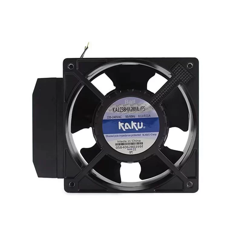 The KAKU KA1238HA2BML/FS is a high-performance 230 V industrial AC axial fan with dimensions of 120 x 120 x 38 mm, integrated with the FS120B/C Failure Alarm system. This unit is purpose-built to deliver elite-level thermal cooling in high-resistance airflow paths while providing real-time monitoring of fan operation. It features a heavy-duty shaded-pole motor capable of sustaining a 21 W power input (at 50 Hz) or 18 W (at 60 Hz) to drive its specialized high-velocity impeller at speeds of 2700 RPM or 3100 RPM respectively. Engineered specifically for air displacement in mission-critical hardware environments, it utilizes a 38 mm deep die-cast aluminum housing and the FS120B/C electronic alarm module to provide balanced pressure and immediate notification of rotation failure. The mechanical design relies on precision maintenance-free ball bearings and a black-painted frame to ensure reliable continuous operation across an ambient temperature range of -20 °C to 70 °C. Featuring a robust lead wire interface and thermal impedance protection, this fan is a critical component for industrial control cabinets, server racks, and high-security power systems where long-term reliability and active status monitoring are mandatory.