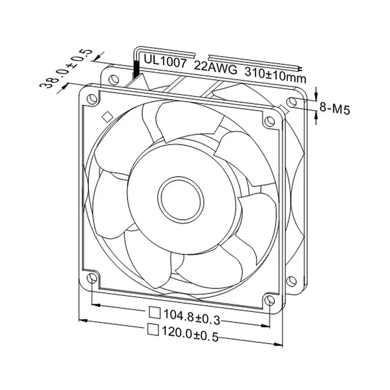 The MUTUAL M115BA2H is a high-performance AC Axial Fan with dimensions of 120 x 120 x 38 mm. Operating within a voltage range of 200V-240V AC (50/60Hz), this unit is designed for versatile industrial cooling applications. It features a 7-blade PBT plastic flame-retardant impeller and a robust die-cast aluminum alloy housing for superior durability. At 60Hz, it delivers a maximum airflow of 200.5 m³/h (118.0 CFM) and a static pressure of 95 Pa (0.38 inAq) with a power consumption of 19W. Equipped with a high-precision dual ball bearing system, the M115BA2H ensures stable performance in extreme environments, ranging from -10 °C up to 75 °C. This specific configuration utilizes a 2-wire termination, allowing for enhanced connectivity and control in mission-critical electrical cabinets and machinery.