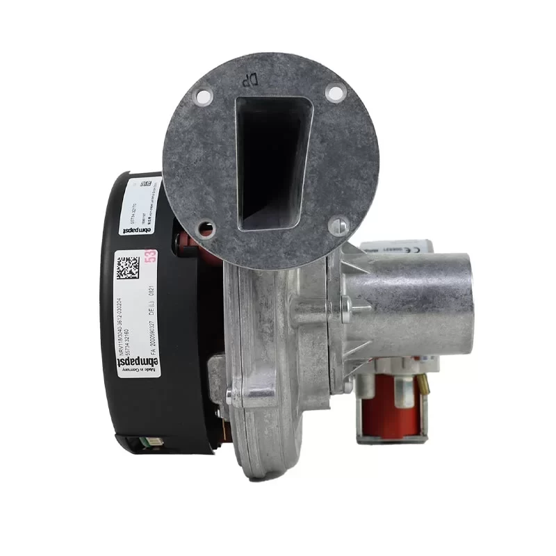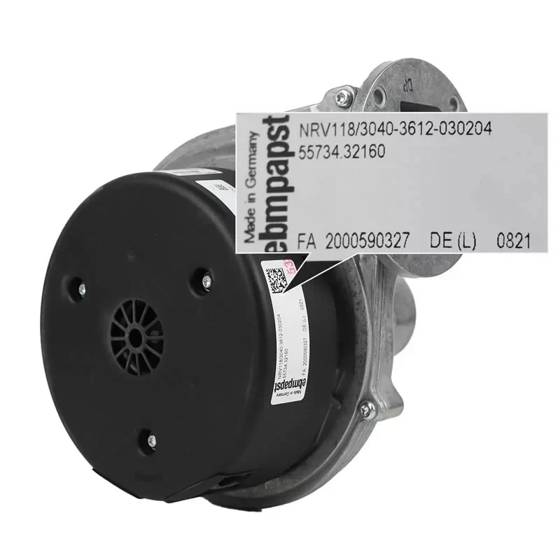 The ebmpapst NRV118/3040-3612-030204 (55734.32030) is a high-performance AC centrifugal fan with a nominal voltage of 230 VAC and dimensions of 174 x 160 mm, specifically engineered for combustion air supply in gas-fired boilers and wall-mounted heaters. Driven by a robust high-speed motor with a power consumption of 70 W and a current draw of 0.57 A, this unit features a heavy-duty dual ball bearing system designed for long-term mechanical stability and continuous S1 duty in high-temperature environments. Its aerodynamic design with a precision-engineered impeller delivers a powerful balance of significant airflow and exceptionally high static pressure at a rated speed of 9000 RPM, making it highly effective at overcoming backpressure in flue gas systems. Constructed with a premium die-cast aluminum housing and high-quality impellers, this 1.8 kg fan provides a dependable and durable ventilation solution with IP40 protection for residential heating systems, gas boilers, and industrial combustion units at the end.