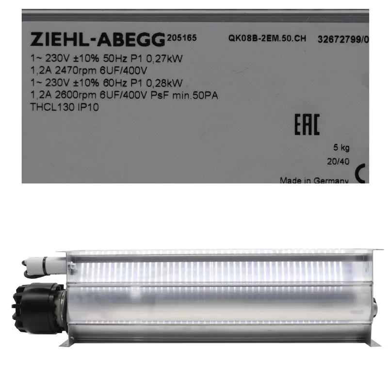 The Ziehl-Abegg QK08B-2EM.50.CH cross-flow fan is used in air curtains, fan coil units, floor trench heating systems, commercial refrigeration displays, dry-type transformers, and industrial cooling for wide electronic panels.