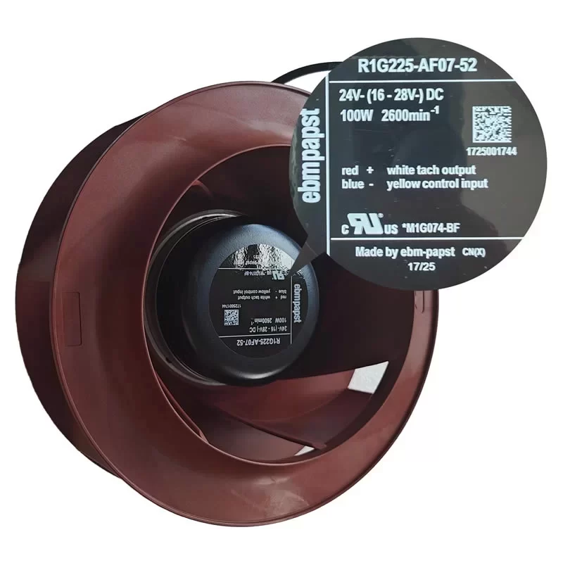 The ebmpapst R1G225-AF07-52 is a high-performance 24 VDC GreenTech EC centrifugal fan featuring a 225 mm backward-curved RadiCal impeller made of glass-fiber reinforced PA66 plastic. Driven by a compact M1G074-BF motor, this unit is engineered for precision air displacement in low-voltage applications, delivering a speed of 2600 RPM with a power consumption of 100 W. Designed for S1 continuous operation, it integrates advanced technical features including a 0-10 VDC/PWM control input, tachometer output for speed monitoring, and comprehensive reverse polarity and soft start protection. This SELV-compliant air-moving solution is ideal for telecommunications, industrial control cabinets, and battery-powered ventilation systems, maintaining high reliability and EMC industrial immunity across an ambient temperature range of -25 °C to 60 °C.