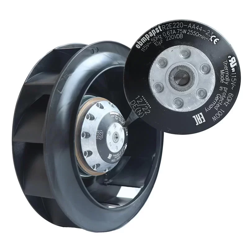 The ebmpapst R2E220-AA44-23 is a specialized 115 V single-phase AC centrifugal fan featuring a 220 mm backward-curved impeller made of high-strength glass-fiber reinforced PA6 plastic. Driven by the M2E068-BF external rotor motor, this unit is engineered for efficient air displacement in 115V power systems, achieving a maximum speed of 2700 RPM. Designed for S1 continuous operation, the fan features a robust ball bearing system and integrated thermal overload protection to ensure long-term reliability. Its versatile design allows for installation in any position, making it an ideal thermal management solution for electronic cabinet cooling and ventilation systems in regions or equipment requiring 115V AC power, operating optimally within an ambient temperature range of -25 °C to 30 °C.
